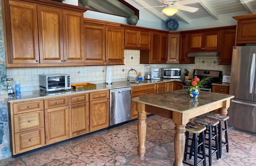 The Living room and dining area are on the entry level with sweeping views. Each area is furnished with truly comfortable sofas and chairs. Open air living and great breezes make for cool tropical living. There are ceiling fans throughout.
