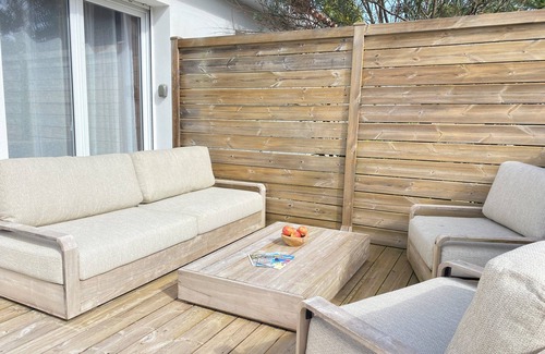 The sleeping area has two bedrooms with double beds and the convertible double sofa bed in the living room offers an additional bed for 2 people. Outside, you can enjoy a beautiful wooden terrace with all the garden furniture for a successful holiday (outdoor table and chairs, parasol, barbecue or electric plancha ...).