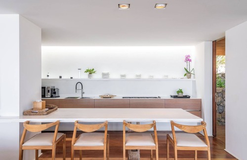 As soon as you come into villa FLOATING GARDEN,you will marvel at the bright decor with clean lines and warm wood in a very contemporary style. In front of the breathtakingview over the ocean and the sunsets, the living room features a white sofa and beautiful benches perfect to relax in the quiet. Close to this open space, the dining room welcomes you around a wooden table and benches, to accommodate guests in front of the wonderful panorama. The well-equipped kitchen has a breakfast bar for pleasant moments over a coffee in the morning or for a snack whatever the time. On the side, there is an opening onto the terrace with an outdoor dining table sheltered under a beautiful pergola that filters the sun's rays, a best place to have al fresco delicious meals cooked on the barbecue at your disposal, for memorable evenings under the starry sky.