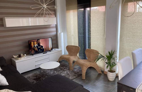 Dispone de un JARDIN PRIVADO de 100 metros rodeado con un cierre de pinos equipado con un COMEDOR EXTERIOR ,BARBACOA Y PISCINA PRIVADA -WiFi y Parking GRATUITO