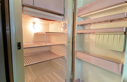 The right-hand door leads into the living room and kitchenette, ideal for reheating leftovers or preparing a quick meal (please note: no gas stove). This intimate space includes a small table with two chairs and a twin bed that doubles as a sofa—an inviting spot to curl up with a good book. The air-conditioning unit is located here in the ceiling.