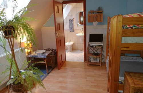 16 beds in 4 rooms with bathroom (including 3 rooms with a view of the slopes on the mountain Czarna Góra), and a room - studio "Łowicki Akcent" with kitchenette, bathroom, balcony for max. 5 people, fully equipped kitchen with dining room with access to the terrace, living room with fireplace, game room with table football, TV.