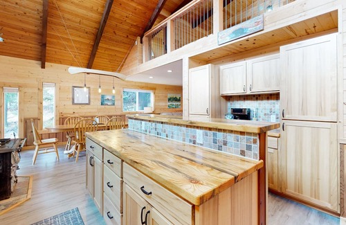 Sitting on Priest Lake's gleaming eastern shoreline, this quiet home is an ideal spot for family vacations and friend getaways. A truly special property, the cabin is custom-built with handcrafted woodworking throughout. From the moment you walk inside, you will immediately feel at home amidst the open layout's soft furnishings, wilderness-themed mementos, and gas fireplace. Hints of rustic charm like the old stove add to the cabin's whimsical feel. Chefs will appreciate the full kitchen's stainless steel appliances (including two refrigerators) and center island. Enjoy a meal together in dining area. Everyone will appreciate the living room's cozy ambiance, perfect for family movie nights with the smart TV.