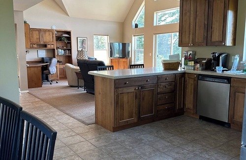 Kitchen – Refrigerator, oven/stove, microwave, dishwasher, coffeemaker, pots/pans, baking dishes, utensils, dishes etc dining table plus more seating at counter.