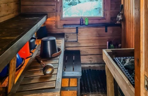Log cabin 2009, kitchen-living room with a sofa bed for 2 persons, dressing room, bathroom, toilet, sauna (wood stove) and terrace. Upstairs with a double bed and a sofa bed for 2 persons and balcony. Downstairs with air source heat pump, underfloor heating and a wood burning stove. 2 fridge-freezers. Small barbecue (bring the coals with you).