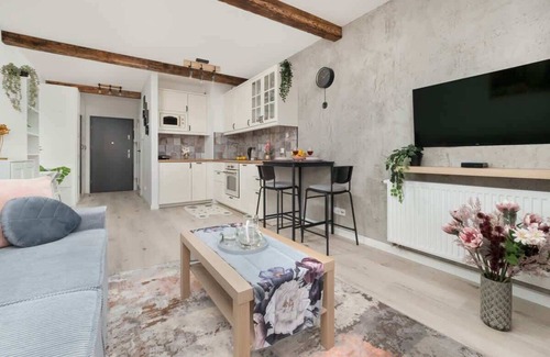 This unique 29.68 m² studio can accommodate 2 people. It is an excellent option for a romantic stay in Lodz or for business travellers. The functional, bright interior, reminiscent of a rustic style, has been designed to provide comfort at a high level. Tastefully selected additions give a cosy atmosphere that makes guests feel at home. The layout of the rooms includes a living room with kitchenette, a balcony and a bathroom with shower. The cosily furnished living area provides relaxation on a comfortable sofa with a sleeping function. The room has been arranged with a desk, which will prove useful when working or studying in front of the computer. The living room leads out onto a balcony equipped with garden furniture. This is the perfect place to start the day with a cup of morning coffee in the fresh air, while enjoying the view of the area. The kitchenette, whose design harmoniously blends with the rest of the apartment, has been equipped with high-quality appliances to make preparing home-cooked meals easier. The bathroom is equipped with a hairdryer and a washing machine to enhance the comfort of each stay. Evening entertainment is provided by multimedia such as a flat-screen Smart TV and free WiFi access. Complimentary toiletries (soap, shampoo and shower gel), towels and bed linen are provided to ease the start of each visit. The apartment's space is functionally designed to meet all guests' needs. An undoubted advantage for those travelling by car is the available parking space, which is located next to the building.
